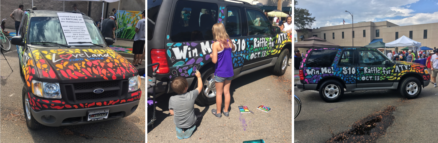 We always sponsor this event and have some Ford related artwork on the sidewalk alongside all the other amazing local artists. This year, however, we decided to do something a little different and create our own canvas. With some help from our dealership employees, we were able to take a 2002 Ford Explorer and turned it into a giant chalkboard on wheels!