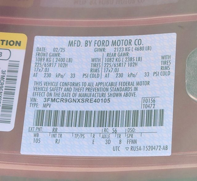 This 2025 Ford Bronco Sport come equipped with, 4-Wheel Disc Brakes, 6 Speakers, ABS brakes, Air Conditioning, Alloy wheels, AM/FM radio: SiriusXM, AM/FM Stereo, Auto High-beam Headlights, Automatic temperature control, Brake assist, Compass, Delay-off headlights, Driver door bin, Driver vanity mirror, Dual front impact airbags, Dual front side impact airbags, Electronic Stability Control, Emergency communication system: SYNC 4 911 Assist, Four wheel independent suspension, Front anti-roll bar, Front Bucket Seats, Front Center Armrest, Front reading lights, Fully automatic headlights, Heated door mirrors, Illuminated entry, Knee airbag, Low tire pressure warning, Occupant sensing airbag, Outside temperature display, Overhead airbag, Overhead console, Panic alarm, Passenger door bin, Passenger vanity mirror, Plaid Cloth Front Bucket Seats, Power door mirrors, Power steering, Power windows, Radio data system, Rear anti-roll bar, Rear Parking Sensors, Rear reading lights, Rear seat center armrest, Rear window defroster, Rear window wiper, Remote keyless entry, Security system, SiriusXM, Speed control, Speed-sensing steering, Speed-Sensitive Wipers, Split folding rear seat, Steering wheel mounted audio controls, SYNC 4 w/Enhanced Voice Recognition, Tachometer, Telescoping steering wheel, Tilt steering wheel, Traction control, Trip computer, Variably intermittent wipers, Wheels: 17 Oxford White-Painted Aluminum. Price includes: $1000 - SUV Spike Retail Bonus Cash. Exp. 02/16/2026 $2000 - Retail Customer Cash. Exp. 03/31/2026