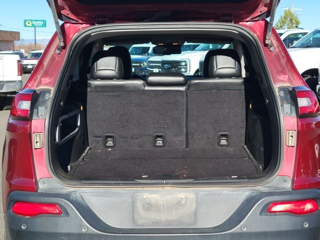 This 2015 Jeep Cherokee come equipped with, 4-Wheel Disc Brakes, 6 Speakers, 8.4 Touch Screen Display, ABS brakes, Active Grille Shutters, Adaptive Cruise Control w/Stop & Go, Advanced Brake Assist, Air Conditioning, Alloy wheels, AM/FM radio: SiriusXM, Anti-whiplash front head restraints, Auto High Beam Headlamp Control, Auto-dimming Rear-View mirror, Automatic temperature control, Auxiliary Transmission Oil Cooler, Blind Spot & Cross Path Detection, Brake assist, Bumpers: body-color, Compass, Delay-off headlights, Driver door bin, Driver vanity mirror, Dual front impact airbags, Dual front side impact airbags, Electronic Stability Control, Emergency communication system, Engine Oil Cooler, Exterior Mirrors Courtesy Lamps, Exterior Mirrors w/Supplemental Signals, Four wheel independent suspension, Front anti-roll bar, Front Bucket Seats, Front Center Armrest, Front dual zone A/C, Front fog lights, Front reading lights, Full Speed FWD Collision Warn Plus, Fully automatic headlights, Garage door transmitter, GPS Antenna Input, Harman Radio Manufacturer, Heated door mirrors, Heated front seats, Heated steering wheel, Illuminated entry, Integrated Voice Command w/Bluetooth®, Knee airbag, Lane Departure Warning Plus, Leather Shift Knob, Leather Trimmed Bucket Seats, Low tire pressure warning, Manufacturer's Statement of Origin, Normal Duty Suspension, Occupant sensing airbag, Off Road Suspension, Outside temperature display, Overhead airbag, Overhead console, Panic alarm, Parallel & Perp Park Assist w/Stop, ParkSense Rear Park Assist System, ParkView Rear Back-Up Camera, Passenger door bin, Passenger vanity mirror, Power door mirrors, Power driver seat, Power steering, Power windows, Quick Order Package 27G, Radio data system, Radio: Uconnect 8.4A AM/FM/SXM/BT, Rain Sensitive Windshield Wipers, Rear anti-roll bar, Rear reading lights, Rear seat center armrest, Rear side impact airbag, Rear window defroster, Rear window wiper, Remote keyless entry, Roof rack: rails only, SafetyTec, Security system, Speed control, Speed-sensing steering, Split folding rear seat, Spoiler, Steering wheel mounted audio controls, Tachometer, Technology Group, Telescoping steering wheel, Tilt steering wheel, Traction control, Trip computer, Turn signal indicator mirrors, Uconnect Access, Variably intermittent wipers, Voltmeter, Wheels: 18 x 7 Polished Aluminum.